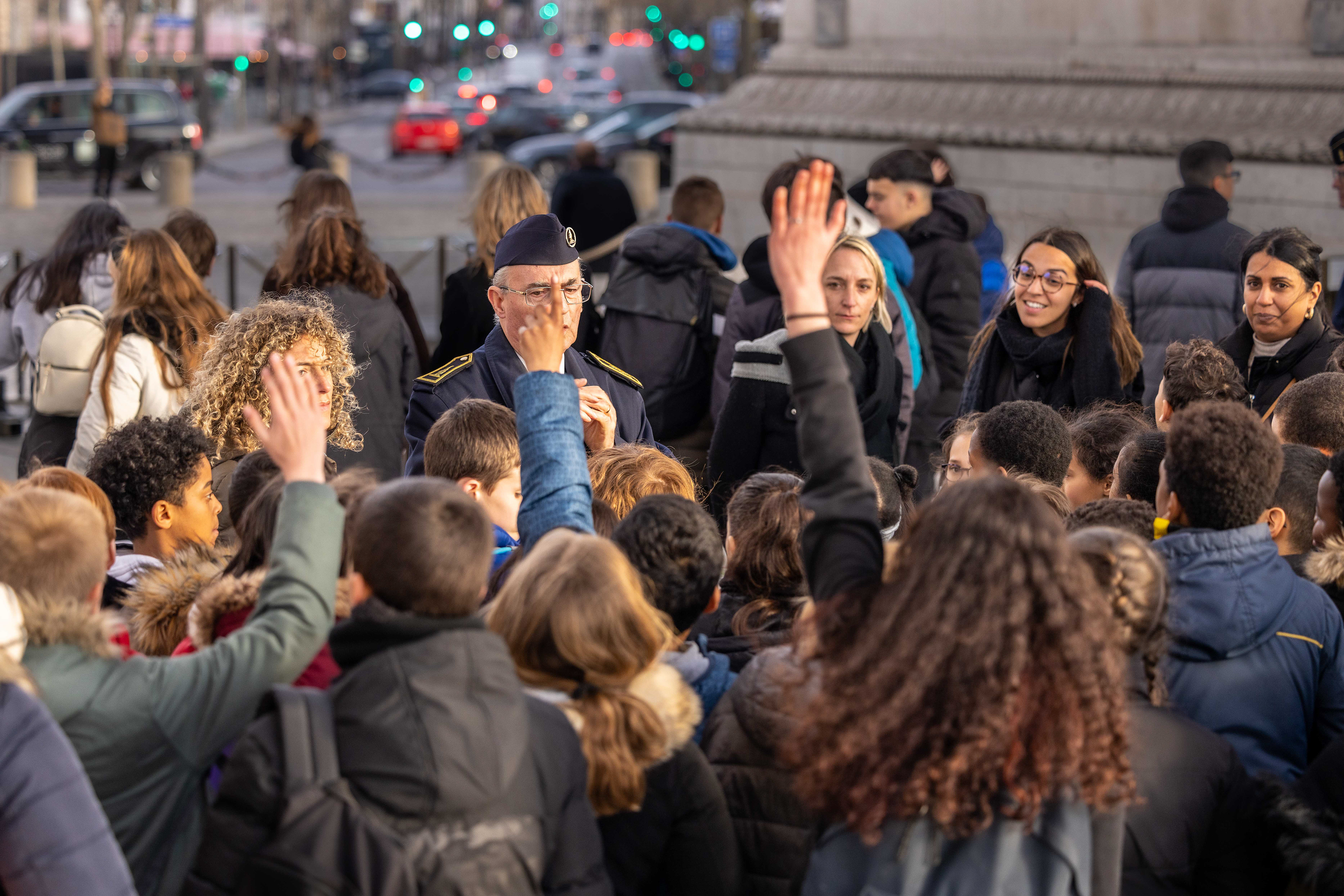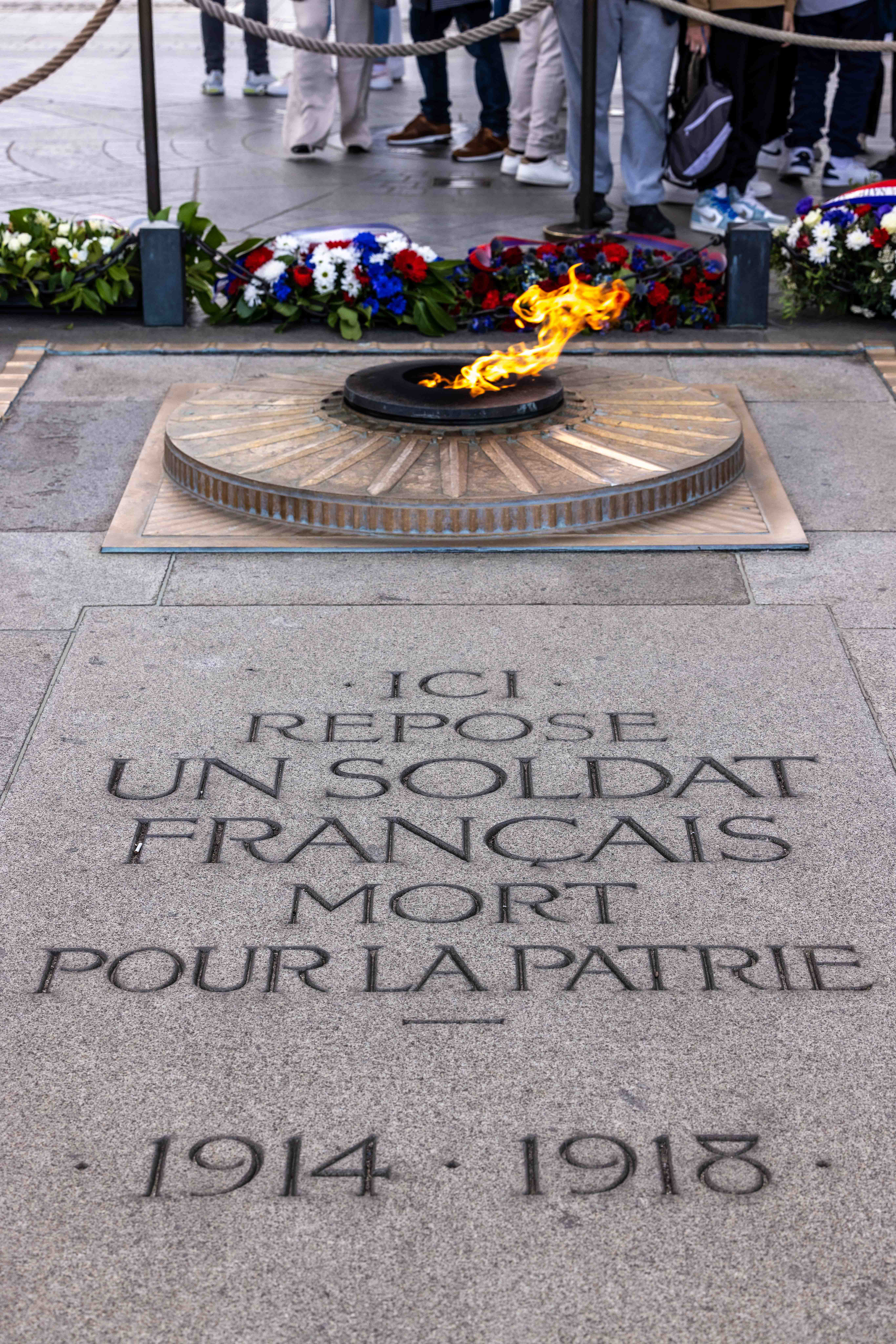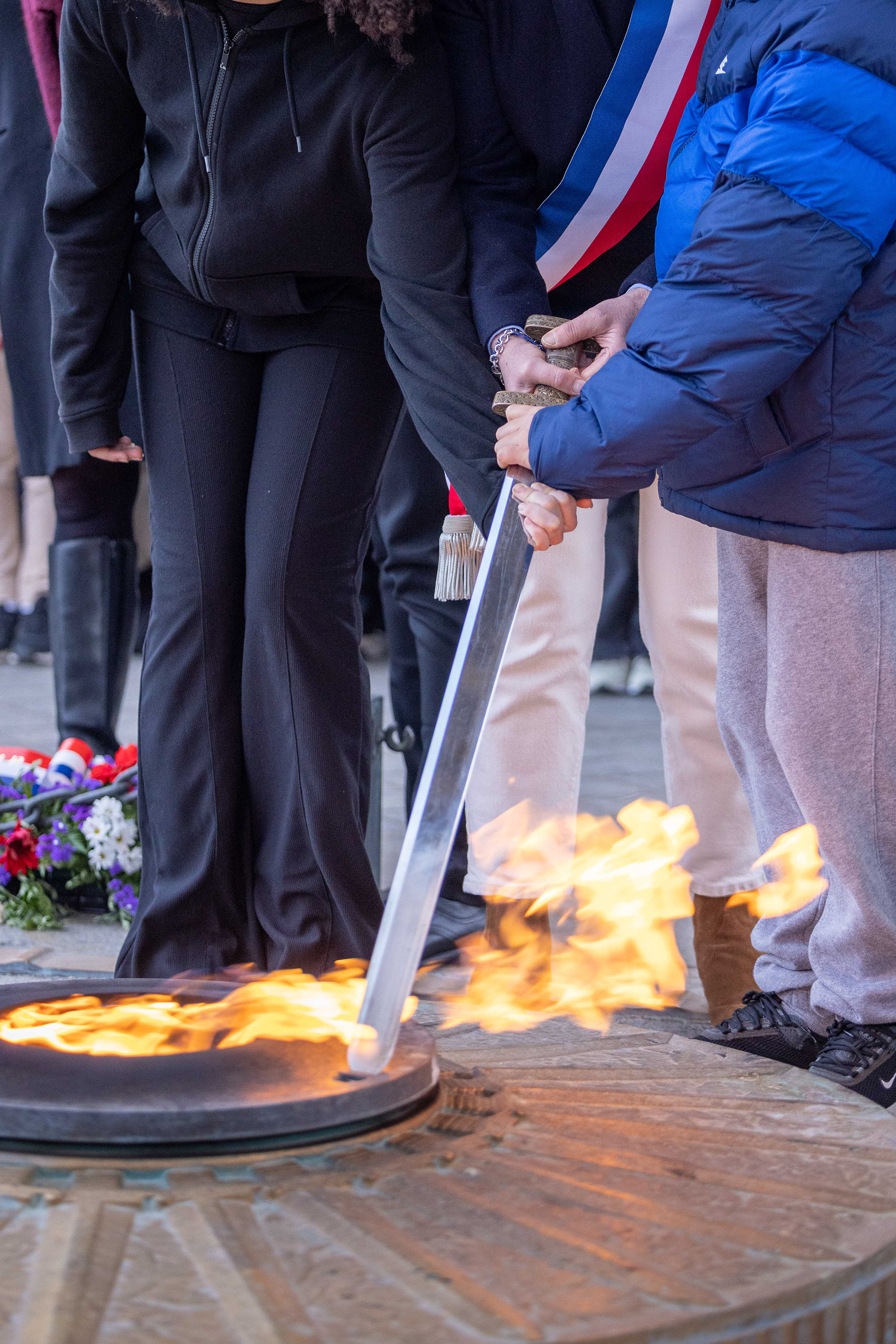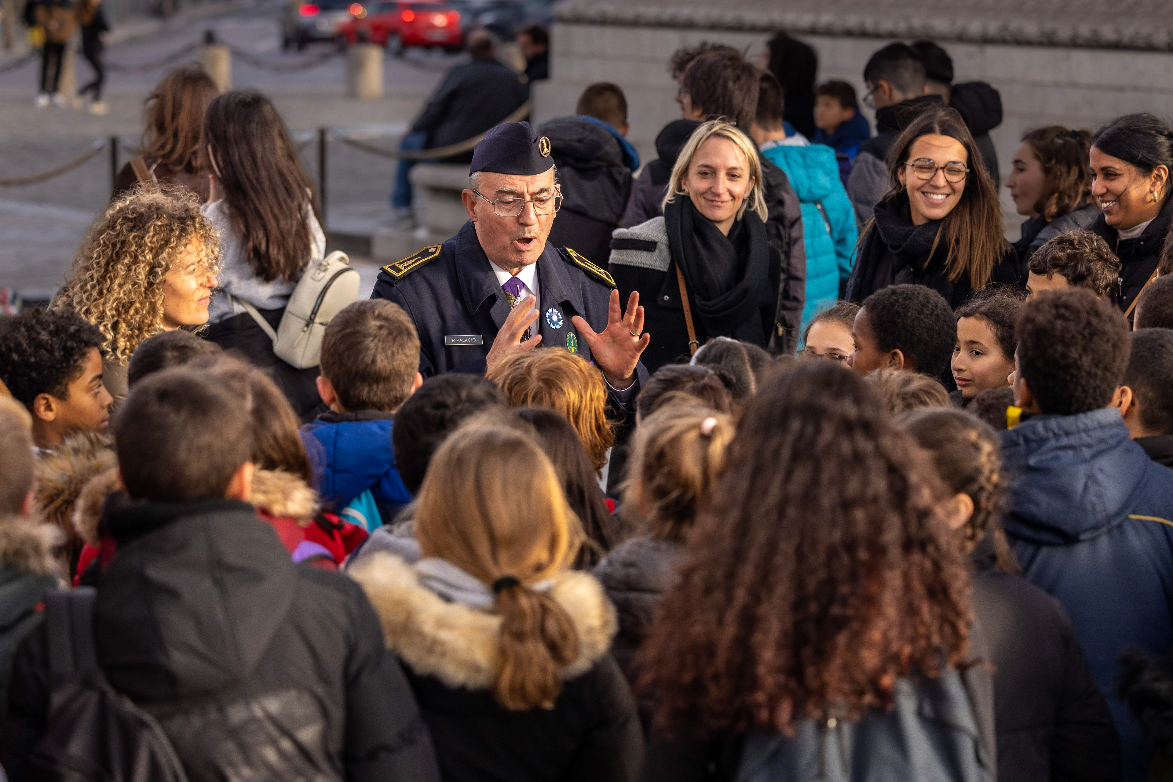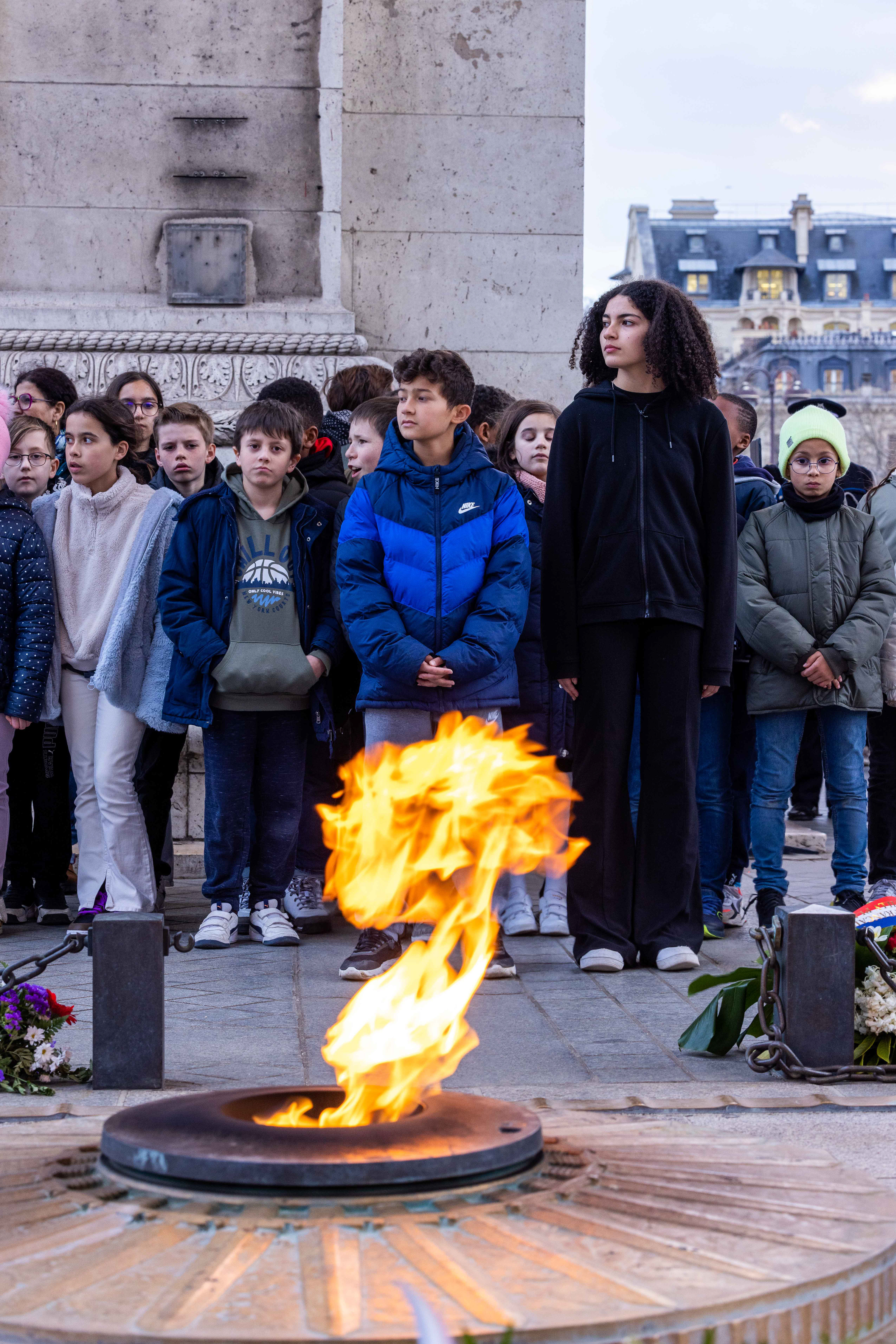 Le ravivage quotidien de la Flamme sur la tombe du soldat inconnu voit souvent défiler des groupes de scolaires afin de familiariser les plus jeunes à ce rituel parisien qui a fêté ces 100 ans en 2023.